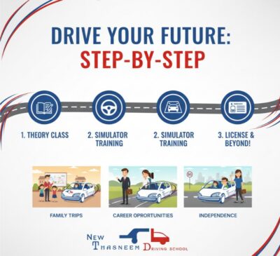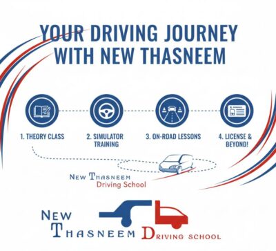 NEW THASNEEM DRIVING SCHOOL: Your journey to confidence and independence begins with us! We offer a comprehensive learning experience covering Classroom Knowledge, state-of-the-art Simulator Training, and practical On-Road Practice. Get ready to earn your License & Freedom with our expert instructors and streamlined process. Start driving safely today!